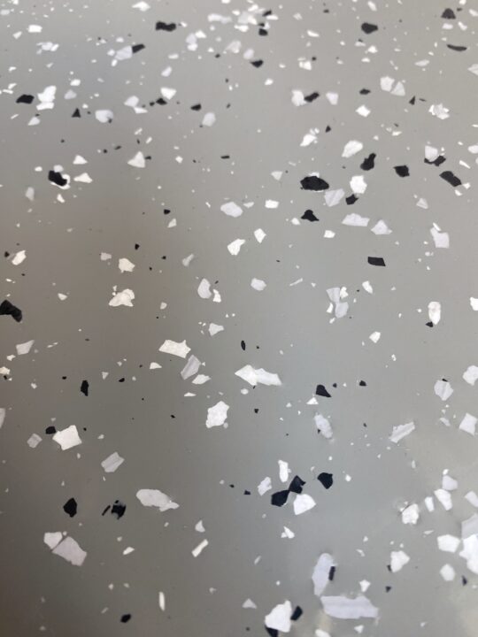 · «Флоковый ковёр». Поверхность у этого покрытия фактурная, что-то среднее между гладким и шероховатым вариантом покрытия. На слой цветной эпоксидной смолы сплошным ковром засыпаются специальные акриловые чипсы-флоки, а сверху закрываются слоем прозрачной эпоксидной смолы. С точки зрения дизайна — это самый нарядный вариант. С точки зрения практики — идеальная маскировка царапин и пыли. Если вы перфекционист и переживаете, что на полу будет видна каждая соринка или след от колес, берите флоковый ковёр. Он прощает всё.